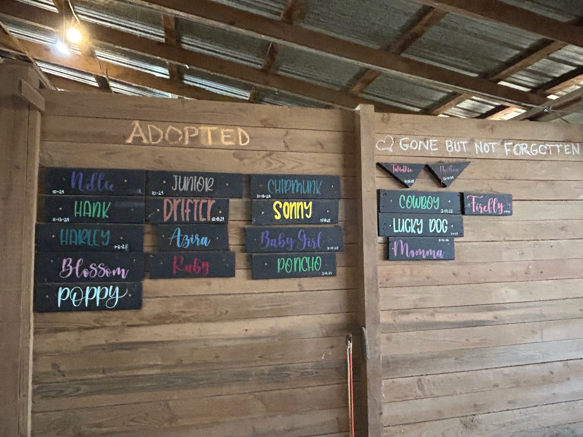 There is a wall at in our barn at STH where we post the names of our animal rescues that have been adopted, and the much smaller (thankfully) number of rescues who have passed away while with us.